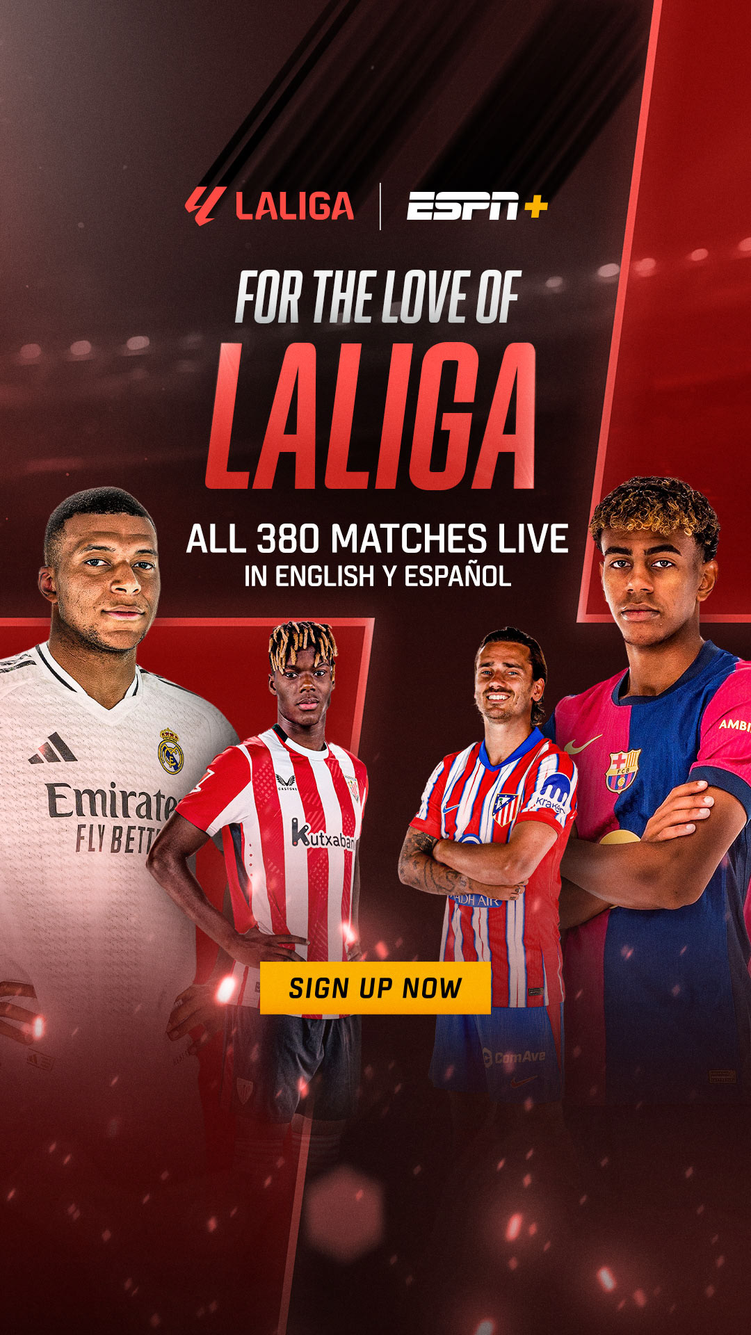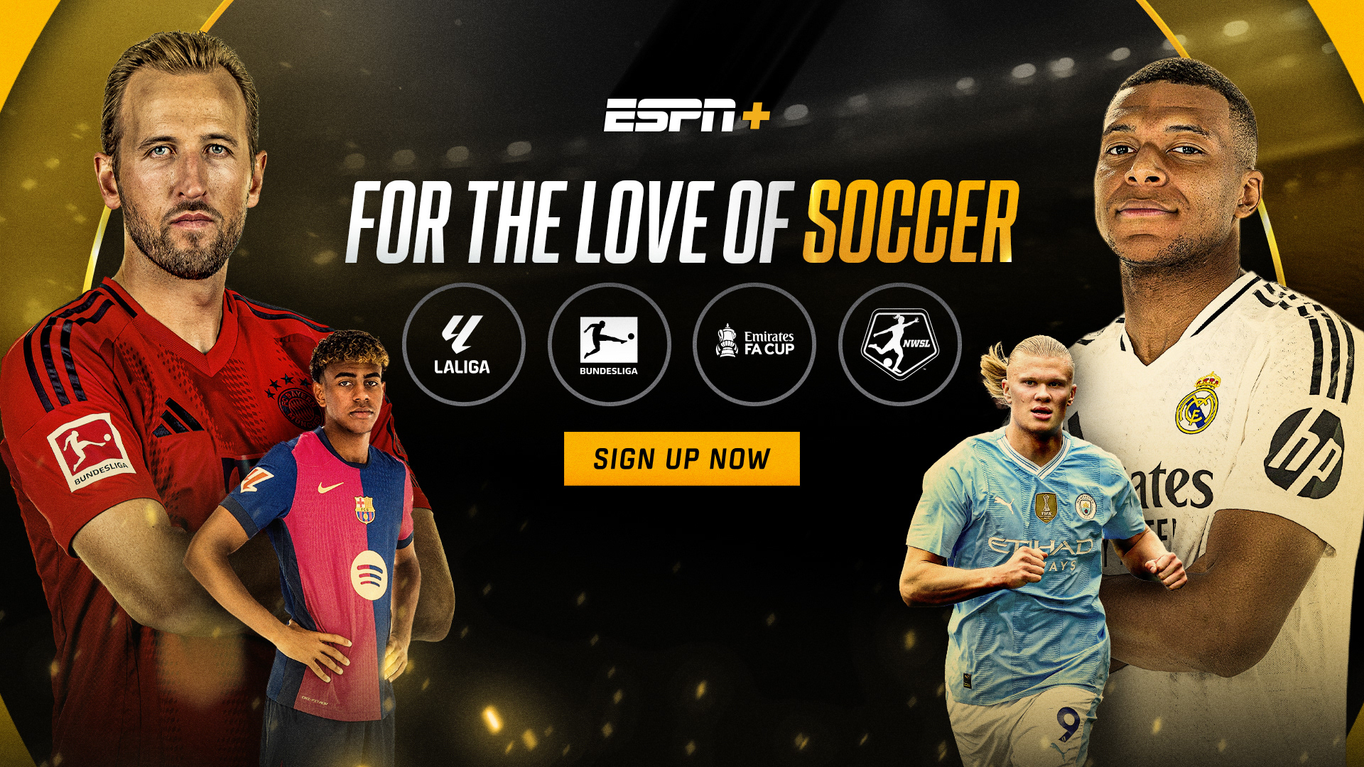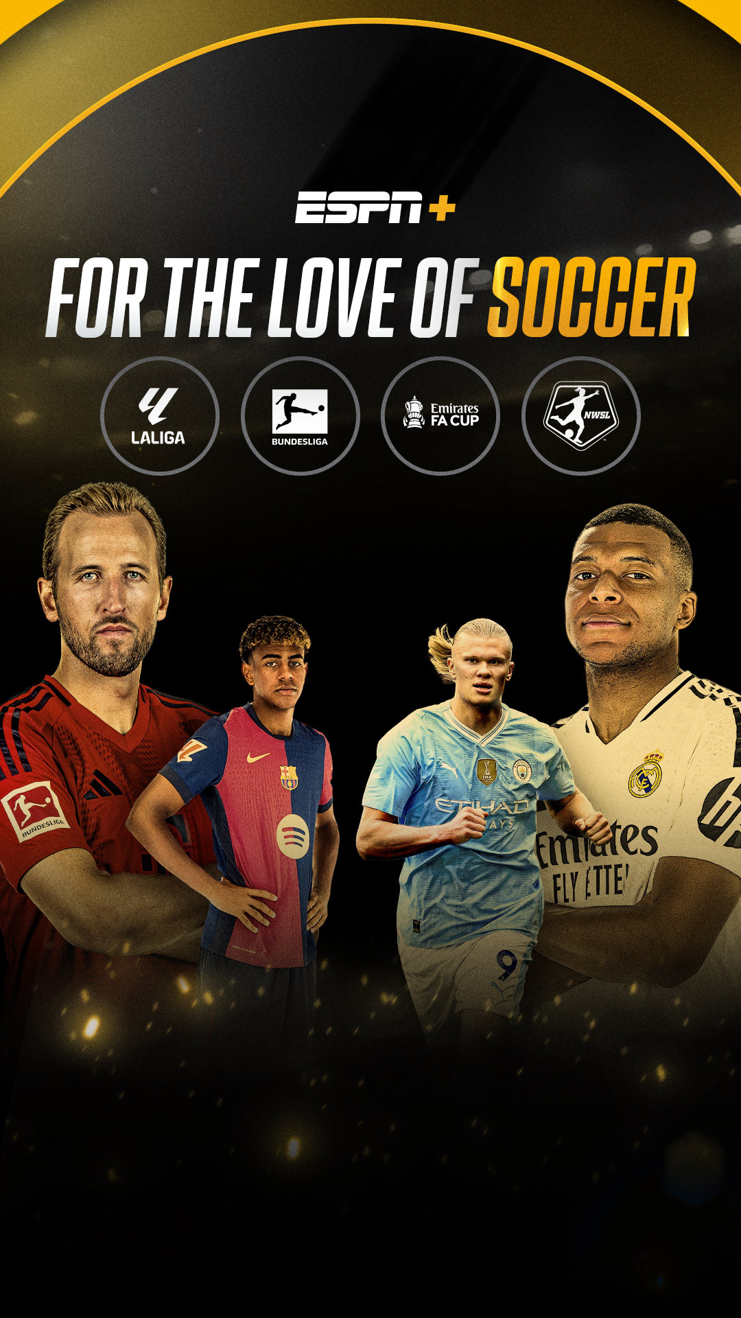I led ideation and creative direction for ESPN’s soccer coverage, shaping the overall digital look and feel across platforms. The work included the overarching “For the love of Soccer” campaign as well as individual league campaigns for LaLiga, Copa del Rey, the FA Cup, Der Klassiker, and other major competitions. Key art was developed in multiple sizes and formats for individual players, marquee matchups, and broader tournament messaging. The campaign featured some of the sport’s top stars, including Kylian Mbappé, Lamine Yamal, Erling Haaland, and Harry Kane. I established the key art direction and visual system, which was then extended across additional placements by the design team, including display advertising, email, marketing landing pages, PR assets, and social executions across platforms such as Meta, Google, and Snapchat.